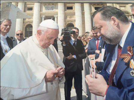 Депутат Госдумы от КПРФ Павел Дорохин поздравил Папу Римского Франциска с наступающим Днем Победы и подарил ему георгиевскую ленточку, передает РИА Новости.