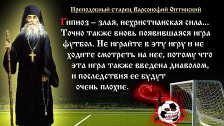 В те далекие годы преподобный Варсонофий Оптинский в беседе со своими духовными чадами пророчествовал: «Гипноз - злая, нехристианская сила. Точно также вновь появившаяся игра футбол. Не играйте в эту игру и не ходите смотреть на нее, потому что эта игра также введена диаволом, и последствия ее будут очень плохие...»