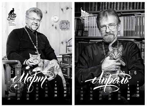 Самый нашумевший отечественный календарь на 2016 год. На фото – священники Москвы и Московской области со своими котами. Имена котов, указанные на календаре, удивляют разнообразием: Боня, Моня, Мотя. Автор идеи Ксения Лученко заявила, что вдохновили ее Calendario Romano с католическими священниками и календарь I Gatti di Roma с римскими котами. Правда, в отличие от ватиканского календаря, здесь сомнений в том, что все священники настоящие, не возникает.